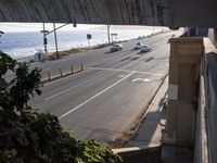 This stock photo features a view from a tunnel in Los Angeles, California, USA, overlooking an open street with a beautiful ocean and freeway. The architecture of the tunnel is made of concrete, and the road surface is covered in asphalt. The coastal scenery creates a pleasant atmosphere, with clear skies and water glistening in the sunlight. The residential neighborhood can be seen in the foreground, showing the suburban setting. This elevated walkway provides a unique perspective of the infrastructure, including a concrete bridge and highway lanes. The image was taken during the day, highlighting the high level of detail and clarity. This picture is ideal for illustrating transportation, suburban living, or urban exploration concepts.