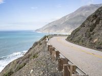 Scenic drive along the iconic Pacific Coast Highway in Big Sur, California. Majestic mountains meet the sparkling blue ocean. Clear skies and curving roads showcase the stunning coastal landscape.