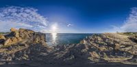 a panoramic view of the ocean with rocks and sand surrounding it and a cloudy sky