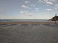 the empty parking lot near the ocean under a cloudy blue sky is surrounded by gray stones