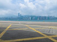 This is an image of a city skyline in Hong Kong, with skyscrapers dominating the urban landscape. The photo captures a coastal area, with a pier and harbor in the foreground. The cityscape reflects a busy and vibrant city life, with low-lying buildings and urban design. The clear sky contrasts with the clouds hovering above. In the distance, two planes are seen landing at the airport, located next to the water and land. This photo represents the bustling and coastal atmosphere of Hong Kong.