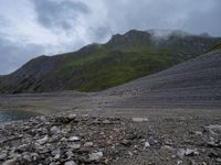 Open space in Austria featuring a dirt surface alongside a serene lake. The gravel area provides perfect conditions for an off-road experience. Cloud-dotted skies envelop surrounding mountains, offering a unique European landscape by the water.