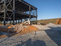 This is an image of an off-road construction site in the USA. The clear sky provides a sunny backdrop to the construction equipment and buildings. The road and dirt surface are covered in gravel, while the hard shadows cast by the buildings and steel structures create an interesting play of light and dark. This photo captures the architecture and construction happening at the job site and represents a typical day in the construction industry.