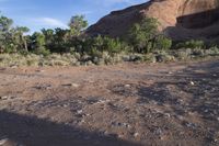 Experience the rugged beauty of Utah's desert landscape as you navigate an off-road track through the red rock canyonlands. The dirt is rocky and there are small shrubs in front of a rocky hill at the edge. Discover the breathtaking views of the mountainous terrain and immerse yourself in the wildness of nature. Traverse the bedrock and gravel surface, marveling at the unique geology and wadi formations. This photo captures the untouched wilderness of North Wash, showcasing the striking contrast between the red rock and the surrounding sandthrax. It's a perfect day for an adrenaline-filled adventure in Utah's remarkable desert terrain.