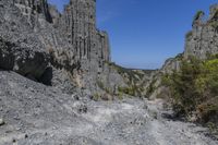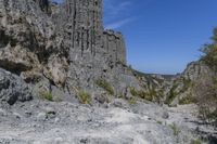This image showcases a rugged canyon landscape with eroded rock surfaces and vegetated outcrops. The clear sky contrasts with the rocky formations and highlights the rugged and natural beauty of the mountainous terrain. The erosion and fault lines are visible, revealing the history of the land. The dirt and gravel surface indicate that this location is off-road and possibly a popular track for adventure seekers. Overall, this photo captures the dynamic and untouched nature of the area, making it a perfect representation of a day in the wilderness.
