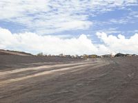 A scenic landscape with a dirt road winding through mountains. The clear blue sky dotted with fluffy cumulus clouds provides a picturesque backdrop. The road surface, a mix of sand and gravel, adds to the rustic charm of this off-road track.