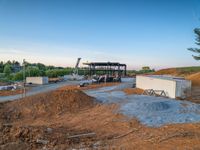 A clear sky backdrop illuminates a modern office building on an open space construction site in the USA. The dirt and gravel surface tracks and roads showcase the architecture and steel structures under sunny conditions.