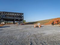 A sunny day at a construction site in the USA. Clear skies provide a backdrop for the steel building and office facility. Gravel and dirt surfaces surround the job site, with equipment and tracks visible.