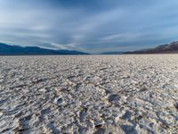 This is an image of a vast open desert with white sand in the foreground. The sky above is clear and blue, with distant mountains visible in the background. The serene scene captures the break of day at dawn, with the soft light illuminating the landscape. A road can be seen, traversing the desert, leading off into the distance. The surface is sandy and textured, with sand dunes scattered throughout. This photo represents the beauty and tranquility of an off-road adventure through the desert.