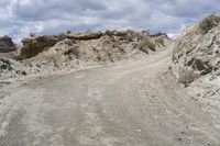 This image depicts a landscape in Tabernas, Spain. In the foreground, there is an empty road surrounded by dirt, rocks, and sand. The gray color of the road surface blends with the surrounding bedrock and soil formation. The cloudy sky adds a dramatic touch to the scene. The off-road track suggests that this area is perfect for exploration and adventure. This photo captures the rugged beauty of the Tabernas desert in Europe.