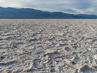 This is an image of a white desert at dawn, with patches of dirt scattered across the surface. In the distance, a person can be seen observing the dirt patches. The sky is filled with clouds, creating a dramatic atmosphere. The open space and sand dunes make it ideal for off-road activities and exploration. This photo captures the tranquility and beauty of the desert landscape. It is a perfect representation of the break of day in a remote and untouched location.