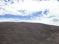 a person riding on a motorcycle through a pile of sand and rocks next to a mountain