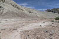a person is riding a small motorcycle in the desert looking at a mountain pass with dirt and rocks