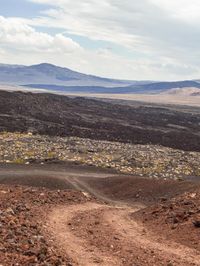 A scenic dirt path meandering through the desert landscape with majestic mountains in the background. Snow-capped sky adds dramatic contrast to the arid terrain. An off-road adventure awaits on this picturesque track.