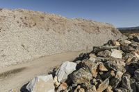 there is a bike rider on a paved dirt road through rocky area near a mountain
