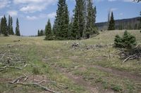 A rugged off-road track in the wilderness of Antonito, Colorado. Nestled among lodgepole pines, the dirt path winds through a grassy field and mountain landscape. Clouds fill the sky over La Manga Pass.