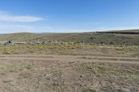 This stunning stock photo captures an off road track in Crested Butte, Colorado. The image features an area with dirt, rocks, and beautiful yellow flowers, as well as an area with brown grass and small bushes. The landscape showcases the majestic mountains and the natural beauty of the Crested Butte area. The clear sky above is adorned with contrails, adding to the overall scenic view. Perfect for illustrating the rugged beauty of nature in Colorado, this photo is ideal for use in travel, adventure, or nature-related projects.
