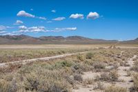 a dirt road leads through an open desert landscape in the distance is a mountains, and blue skies with scattered clouds