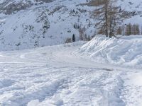A serene winter landscape in the Alps of Switzerland. Snow-covered mountains and low-lying clouds create a dramatic scene at dawn. Off-road track winds through the freezing terrain, offering a thrilling experience for nature enthusiasts.