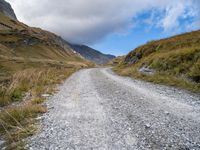 A rugged off-road track in the highlands of Austria. The gloomy grey sky adds to the gloom of the landscape. The road surface, covered in gravel and dirt, winds through the mountainous terrain, surrounded by vegetation.