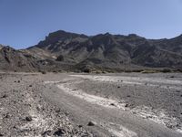 A rugged off-road track in Tenerife, Spain. The rocky landscape and mountain range create a stunning mountain landforms formation. The desert-like terrain features gravel and dirt surfaces. A clear sky completes the picturesque scene.