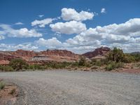 A scenic landscape in Capitol Reef, Utah. Off-road tracks wind through the gravel and dirt roads, with paver and sand streets adding texture to the natural surroundings. Clouds dot the sky on a beautiful day in the USA.