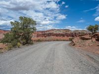 A scenic landscape of the off-road trail in Capitol Reef, Utah. The dirt road winds through gravel and sand, surrounded by breathtaking nature. Captured on a clear day in the USA.
