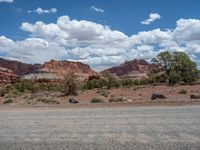 A scenic off-road drive on the dirt tracks of Capitol Reef, Utah. The landscape is dominated by the rugged profiles of the rocky cliffs. Clear blue skies contrast with the sandy and gravel streets of this natural paradise.