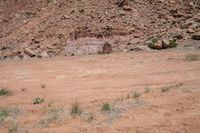 A breathtaking view of Utah's desert landscape, featuring red rock formations and rugged mountain peaks. The brown bedrock and outcrops contrast with the lush vegetation and grassy groundcover. Explore the natural beauty on an off-road track through the canyonlands.