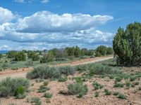 Off-road track in rural Utah, surrounded by picturesque landscape. Gravel and dirt road winds through nature, leading to campgrounds. Clear skies and fluffy clouds create a perfect day for outdoor adventures.