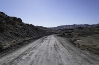 An empty dirt road winds through the red rock landscape of Utah. The clear blue sky contrasts with the rugged terrain. The road stretches through the canyonlands, offering breathtaking views of the mountain ranges.