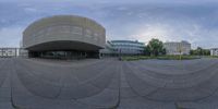 A fisheye view of a modern office building in Berlin, Germany. The architectural design highlights the city's urban and business districts. The clear sky reflects on the building's surface, creating an open space atmosphere in the heart of Europe.