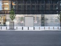 A modern office building in Berlin's financial district. Its futuristic architecture and metal facade make it stand out against the grey urban landscape. Symmetrical windows and vegetation add to its urban design.