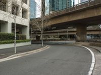A modern office building in a bustling urban business district. The building's windows reflect the surrounding cityscape and clouds above. The road curves beneath an underpass, lined with trees and vegetation. A vibrant example of urban design.