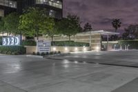 An impressive office building in Los Angeles, California, USA, stands tall against the night sky. The modern architecture and sleek design of the building make it an iconic landmark in the city. The view is taken from a parking lot, providing a unique perspective of the building. The surrounding area is well-lit with street lights and the reflection of artificial light on the road surface creates a captivating atmosphere. The open space and trees add to the overall aesthetic of the metropolitan area. This photo captures the essence of urban design and the bustling business district of Los Angeles.