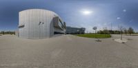 A modern office building in Toronto's business district, surrounded by a parking lot. The building's sleek architecture and glass facade reflect the clear sky. The urban design and straight road create a symmetrical composition.
