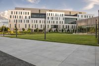 This stock photo features a modern office building located in the business district of Toronto, Canada. The grey building stands out against the lush green grass and surrounding vegetation. The building has a sleek, modern architecture with large windows and a clean facade. The parking lot behind the building is made of asphalt and there are several trees in the area. The photo was taken during the day, with clouds in the sky. This image can be used to represent urban design, real estate, and the business environment in Toronto.