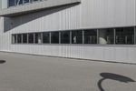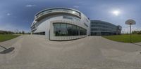 A modern office building in Toronto's business district, surrounded by open space and a basketball hoop. The black-and-white composite material facade stands out against the clear sky. Urban design at its finest.