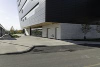 A modern office building in Toronto's financial district. The grey composite material facade reflects the clear sky. The urban design showcases the city's business and financial life. The low-rise building features tinted windows and a well-maintained asphalt road.