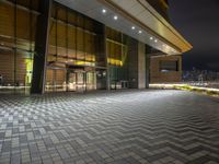 the outside of an office building at night with city lights on it, including a clock, windows and street lights