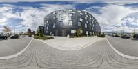 A fisheye lens captures the modern architecture of an office complex in Toronto. Cars parked on the street below depict city life in the business district. A vibrant mix of residential and commercial properties.