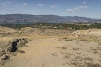 A rugged off-road track in Kelowna, British Columbia, in the Okanagan Valley. The high elevated mountain landscape is covered in grass and vegetation. Clear skies and clouds add to the picturesque scene.