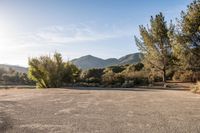 A scenic view of an empty parking lot in Ojai, California. The lot is surrounded by trees and a desert field with mountains in the background. The clear sky and sunlight flares add to the serene landscape.