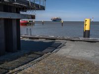 This stock photo showcases an old yellow and red fire hydrant at the entrance of the port in Bremen, Germany. In the distance, a large boat can be seen on the clear sky. The image highlights the industrial setting of the container port, with facades of factories and urban design elements. The coastal location adds to the scenic beauty, with the jetty and pier extending into the ocean. The road surface, made of asphalt and tar, leads to the harbor, providing access for landing and container transportation. This image captures the essence of Bremen's harbor, an important maritime hub in Europe.