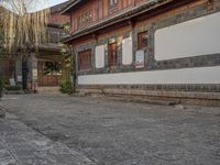 This stock photo captures the charm of a historic neighborhood in the old town of Lijiang, China. The photo shows a picturesque cobblestone road surrounded by low-rise residential buildings and hotels. The classic architecture of the old houses with their characteristic facades is a perfect representation of the traditional Chinese style. The photo was taken at dawn, with a clear sky and the first light of day illuminating the scene. In the foreground, a black cat runs through the street, adding a touch of liveliness to the peaceful atmosphere. This image is ideal for showcasing the cultural heritage, architectural beauty, and tranquility of Lijiang's old village.
