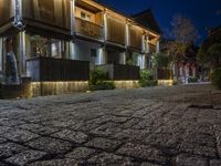 A picturesque view of the old town in Lijiang, China. Cobblestone roads lined with traditional Chinese buildings create a charming and historic atmosphere. The nighttime scene is illuminated by the warm glow of artificial light, making it a popular tourist attraction in Yunnan.