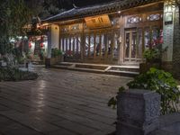 A charming night view of an old town in Yunnan, China. Historic architecture and cobblestone roads create a picturesque scene. Suburban villages come to life with vibrant lights from cafes and restaurants.