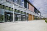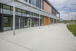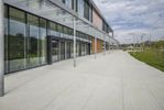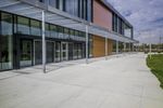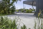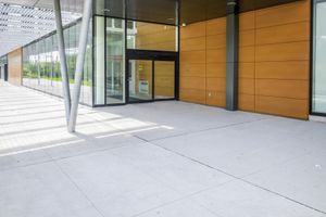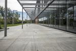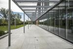 A unique architectural dome in Ontario, Canada. The map-like facade blends with the surrounding landscape. A straight road leads to a mixed-use property with a large window overlooking a beautiful garden.