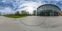 the fisheye lens is reflecting off the building with a large window and view of the garden