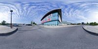 Modern architecture in Toronto, Ontario. A straight road leads to a mixed-use building with a parking lot. The facade features a unique pattern of windows, while the cloudy blue sky adds depth to the scene.